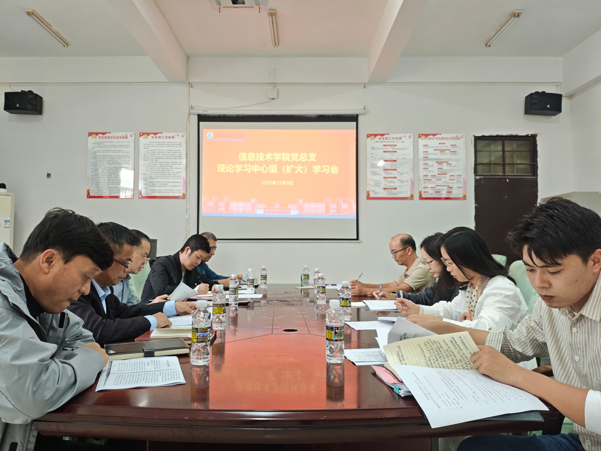 2025年12月9日,信息技术公司党总支召开理论学习中心组(扩大)学习会,深入学习《习近平法治思想学习纲要》中关于“坚持党对全面依法治国的领导”、党的二十届四中全会报告中关于“加快高水平科技自立自强,引领发展新质生产力”和新修订的《中国共产党纪律处分条例》中的第二章《违纪与纪律处分》等内容,结合太阳集团tyc539发展实际研讨落实举措。党总支书记符胜主持会议并作总结讲话,中心组成员王忠、单继周、康东、黄守官等参加学习并交流发言。党政办、教务办和学工办负责人列席会议。
