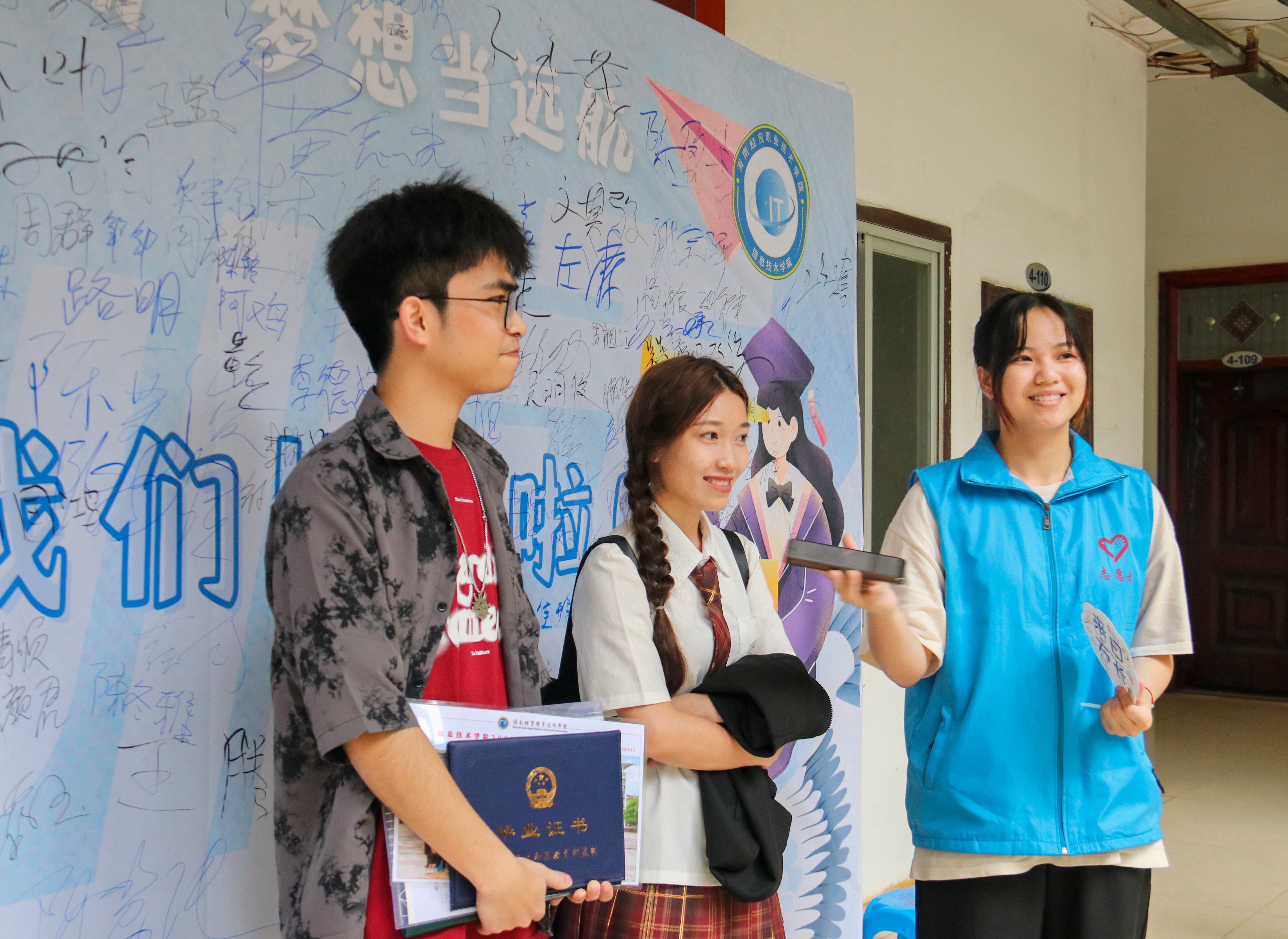 始于一场初秋,终于一场盛夏;始于2020级新生报到处,终于2020级毕业证领取处。毕业生们汇聚一堂,排着长长的队伍,在各个领取窗口处等待,是许久未见的交谈,是激动不已的喜悦。毕业证书是三年学习奋斗的证明,毕业照片是三年青春年华的回忆。返校采访中,“毕业了,有什么话想留给海经贸”、“回想老员工活你觉得记忆深刻的事情是什么”、“有什么建议可以给学弟学妹们”等一系列问题,学长学姐们用亲切的话语,回忆校园时光,献上美好祝福。