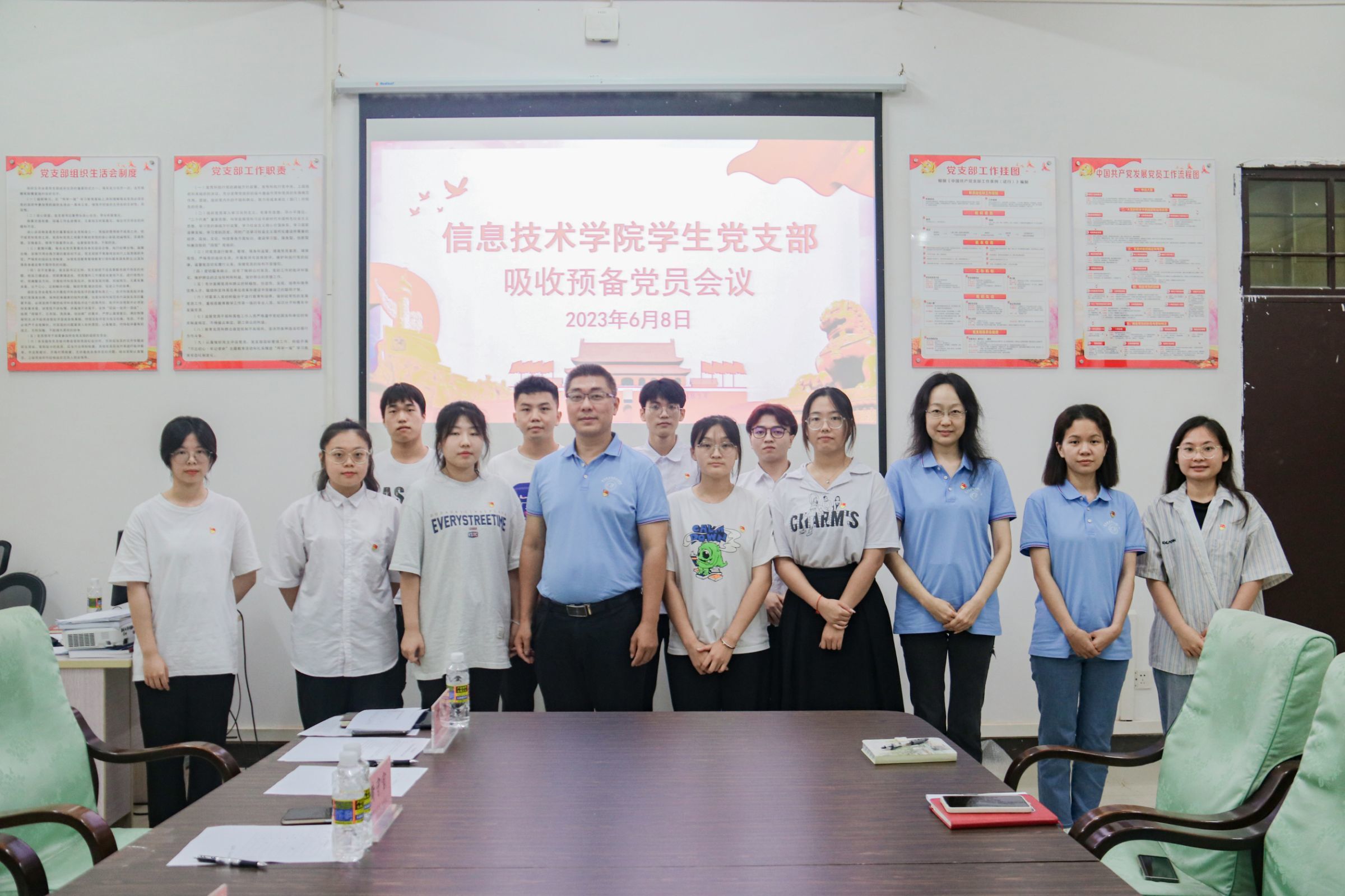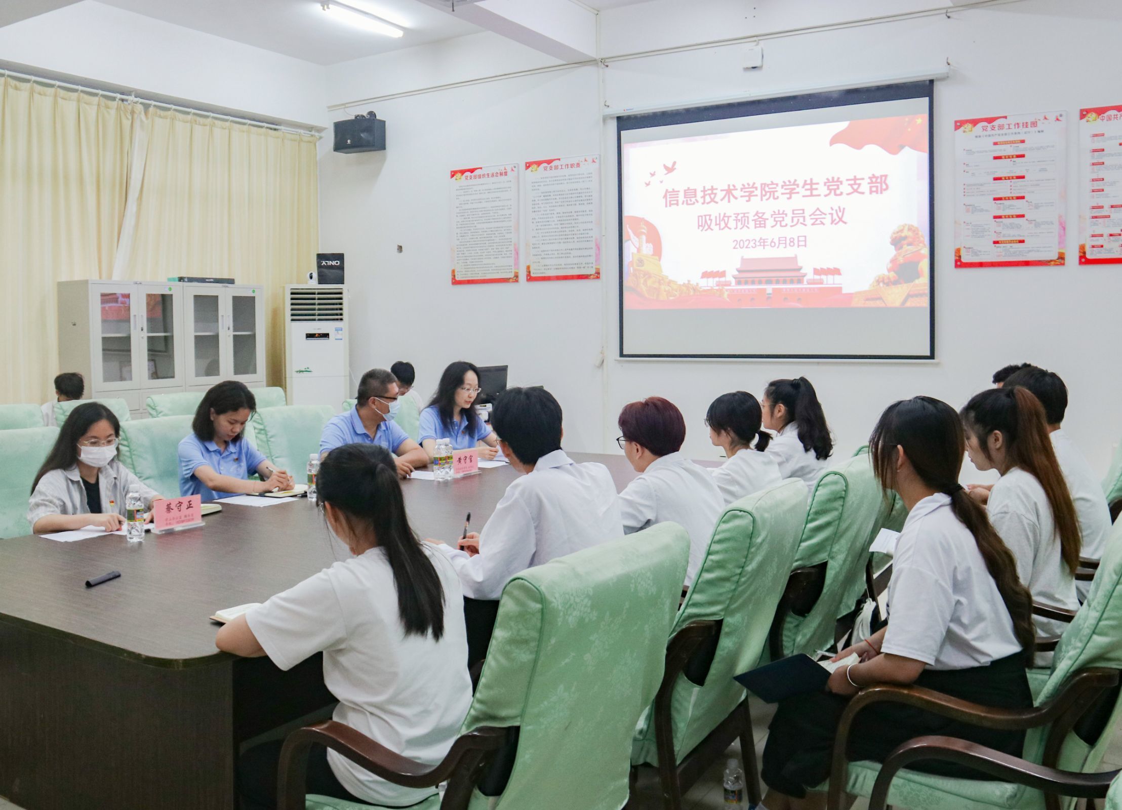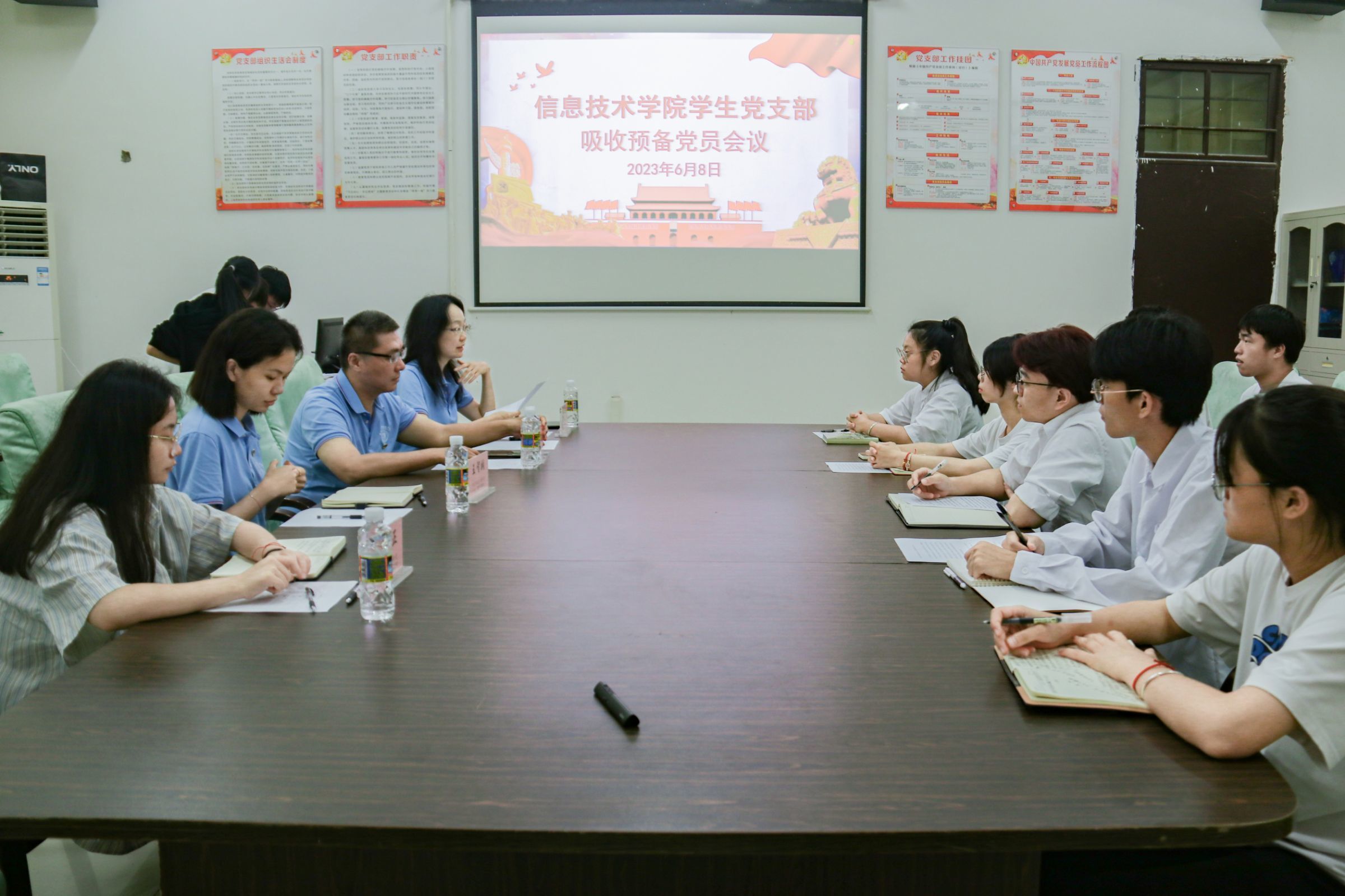 根据员工党支部发展党员工作计划,讨论发展对象符传品等9名同志入党问题,公司员工党支部于6月8日在4-213召开吸收预备党员会议,参加本次会议的有公司党总支副书记黄守官、员工党支部书记代晓明老师、支部委员唐图、蔡守正,支部党员王智娴、吴淑亲以及21级发展对象。
