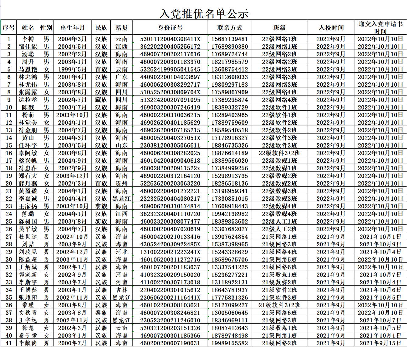 根据《进一步规范和加强公司推荐优秀共青团员入党工作的通知》、《中共中央组织部、共青团中央委员会关于进一步做好推荐优秀团员作党的发展对象工作的意见》、《中共中央组织部关于进一步加强在青年中发展党员工作的意见》、《中共中央组织部、中共中央宣传部、中共教育部党组关于进一步加强高校员工党员发展和教育管理服务工作的若干意见》、《共青团推优入党工作实施办法(试行)》等文件要求,并结合《太阳集团tyc539关于推荐优秀团员作为党的发展对象工作实施办法》的文件精神。经各团支部民主推荐,二级公司团总支审查,校团委审核并公示。2022年11月推优入党名单如下:(41人)