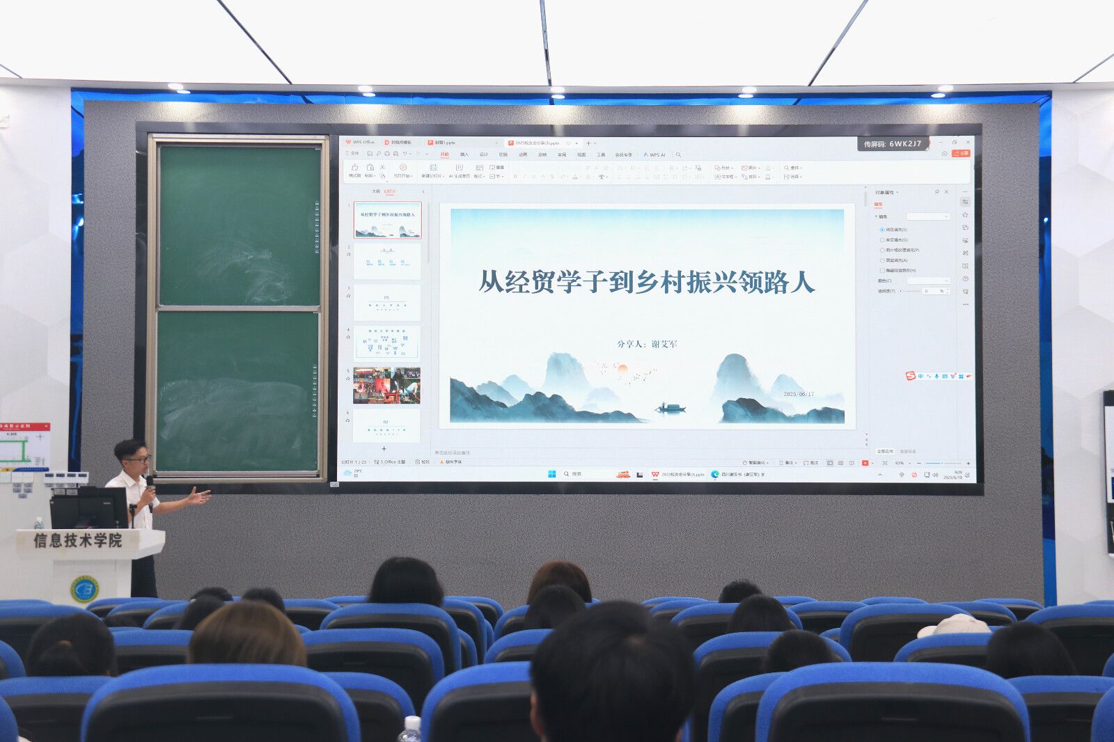 最触动现场的是谢艾军归乡四年的乡村振兴实践。作为四川苍溪兴华村党支部书记,他展示了通过抖音直播带货实现农产品年销售额200万元的案例,讲述发起“支书联盟”、推动基建项目的基层工作经历,播放的“稻田养鱼”助农短视频让师生直观感受乡村振兴的创新实践。