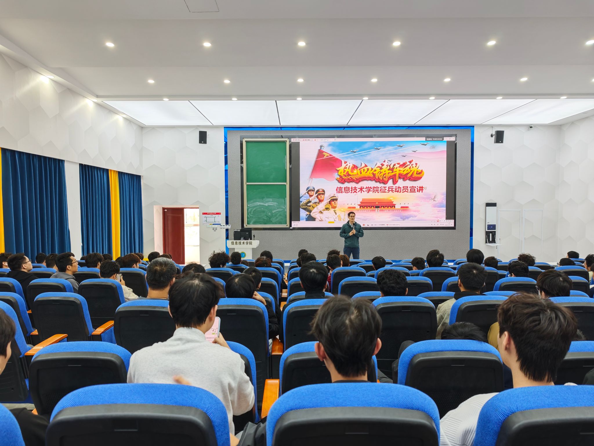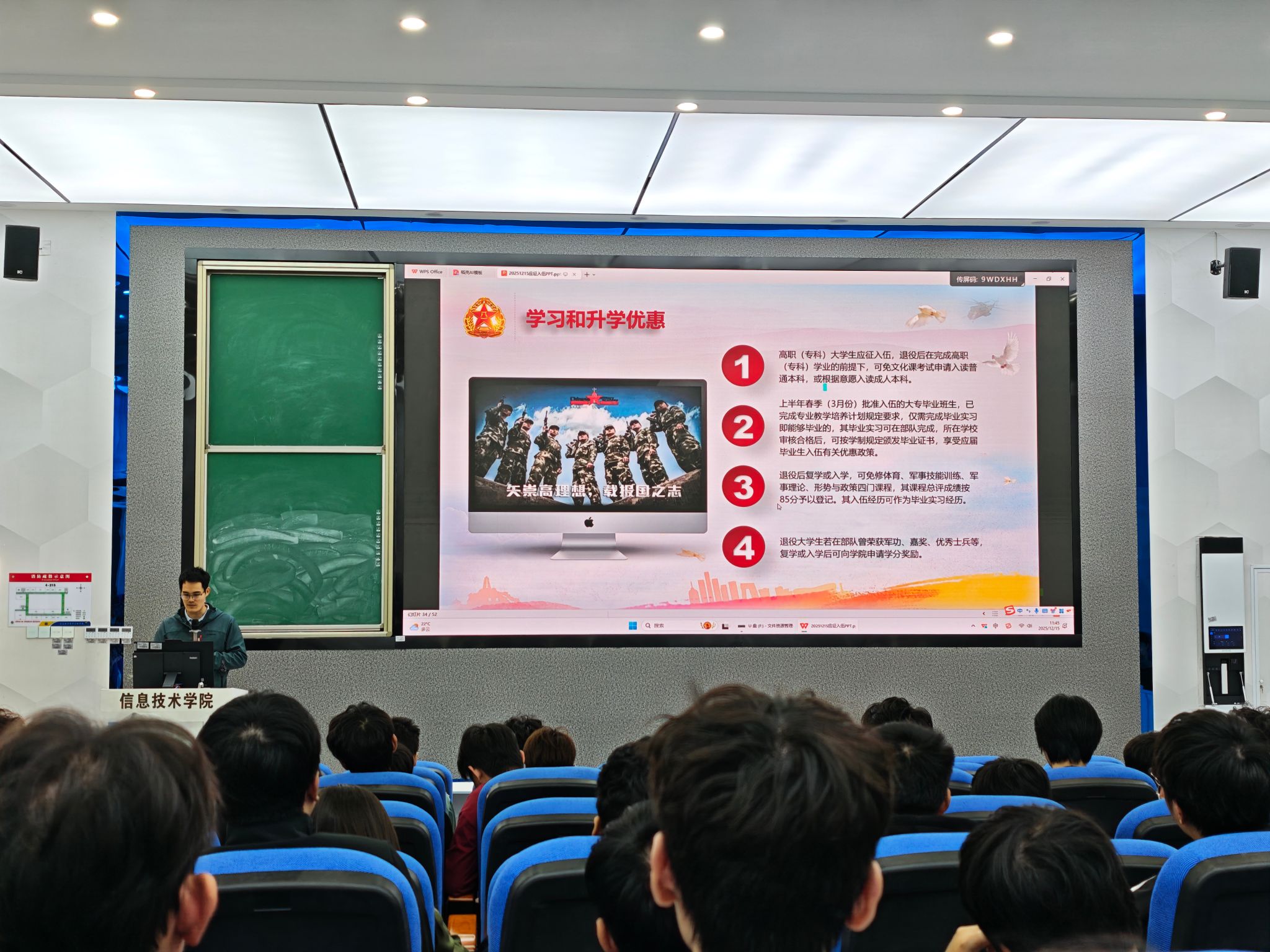12月15日,太阳集团tyc539在4-215教室举办2025年征兵动员宣讲会,针对公司员工特点定制宣讲内容,聚焦学历提升、职业发展、经济补助等员工关切点,为200余名信院学子解读参军政策与成长路径。