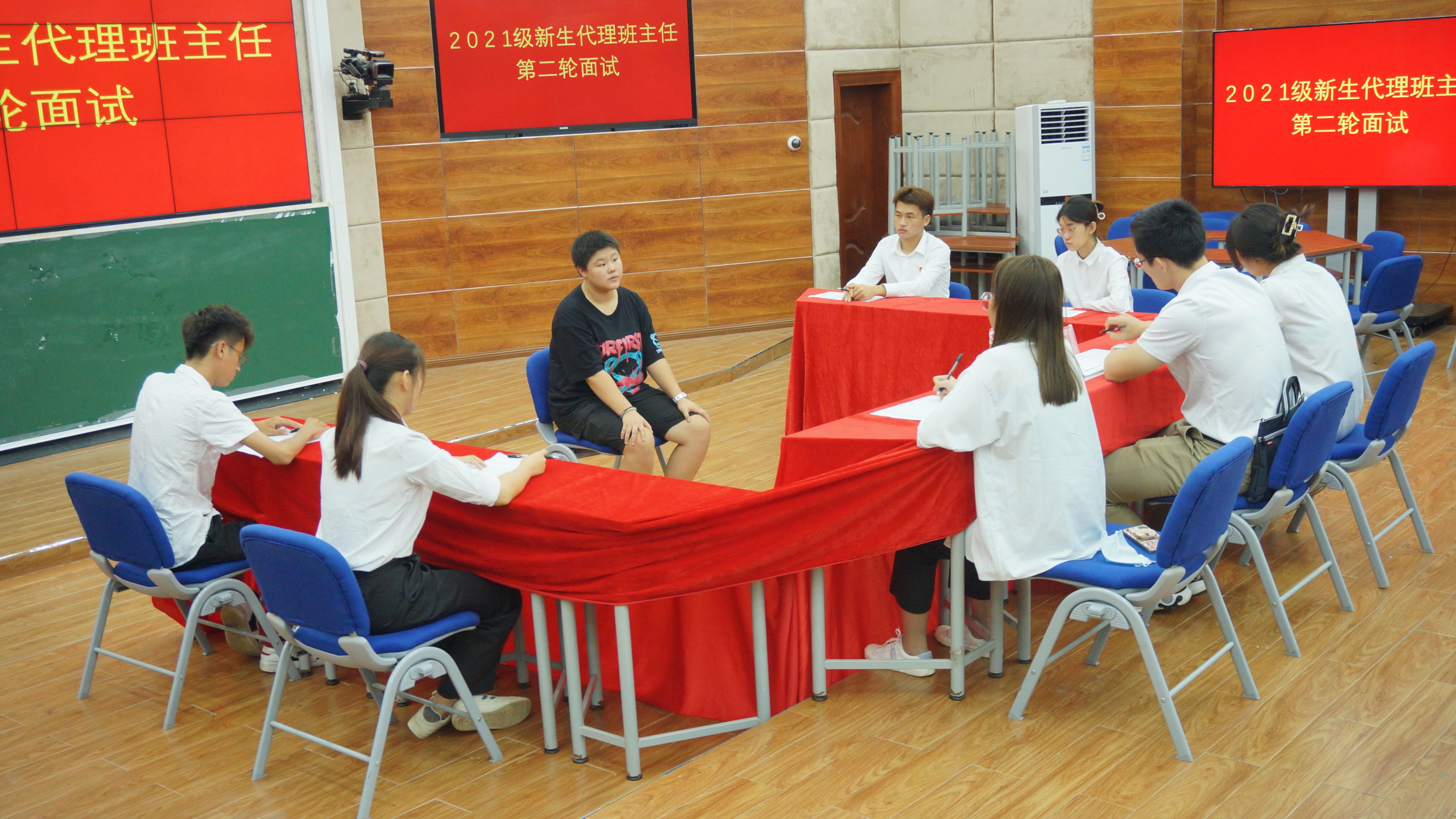 第二轮面试在2-215沉浸式教室举行,由竞选代理班主任的候选人阐述自己竞选代理班主任的理由和自身所具备的优势,再由面试官现场提问,依据代班候选人的回答进行综合评分,对面试人员进行初步筛选。