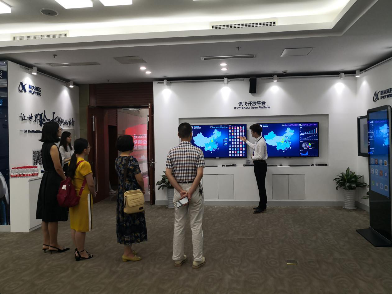 考察组首先走访了科大讯飞总部及产业园,在人工智能展厅详细了解讯飞的人工智能产品,如:智能语音同步翻译机器人、智能语音笔记、针对中小员工的学习伴读机器人、智慧校园、智慧城市、人工智能教学实验平台等相关产品。同时走进讯飞合作院校的团队培训部,学员(各高校教师)学习热情高涨,气氛热烈。参观后在科大讯飞总经理李伟国、王生波等陪同下进行校企合作交流谈判,我方重点在人工智能的专业群建设、人才培养、团队培养、社会服务、实训室建设、已合作成功案例(合作院校)等方面与讯飞科技进行咨询和讨论。讯飞科技就海南自贸港建设、海南省的发展规划、海南经贸发展战略、公司信息公司的未来规划等与考察组展开了广泛交流,双方达成初步合作意向。