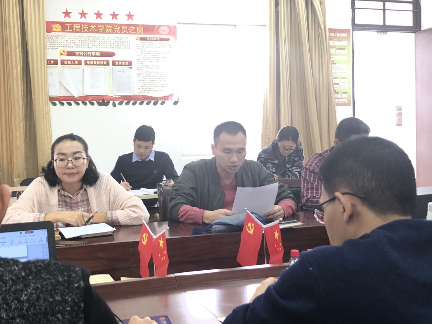 教师党支部书记韩昌豪作述职汇报,在过去一年,教师党支部过于重视教务工作而轻视党建的重要性,党支部开展的主题党日活动趣味性、时效性不足,党小组的领导力较弱,在接下来的2020年,将继续学习先进的理论知识,弥补自身不足,提升党建业务能力,加强支部党员干部的管理。