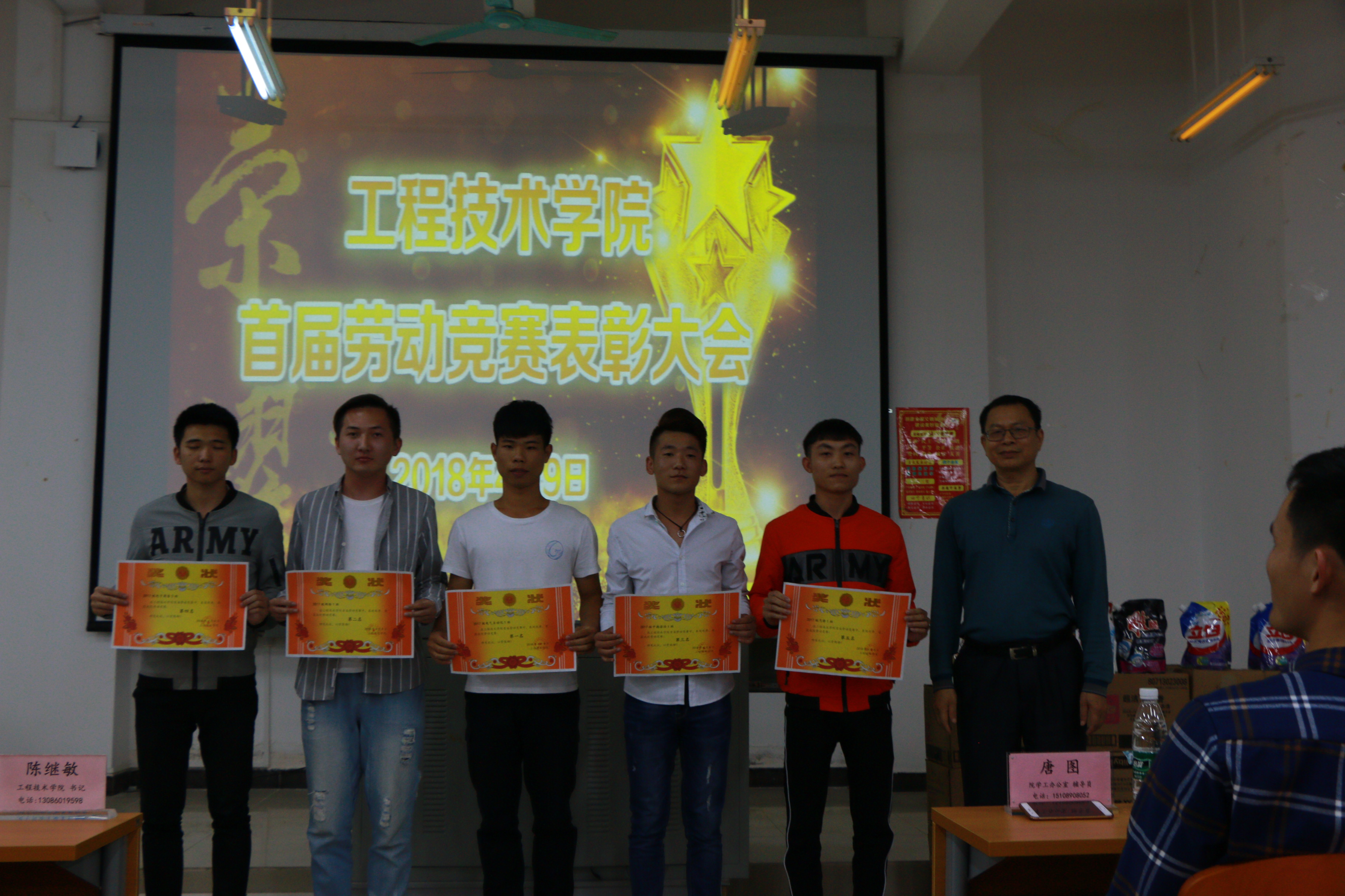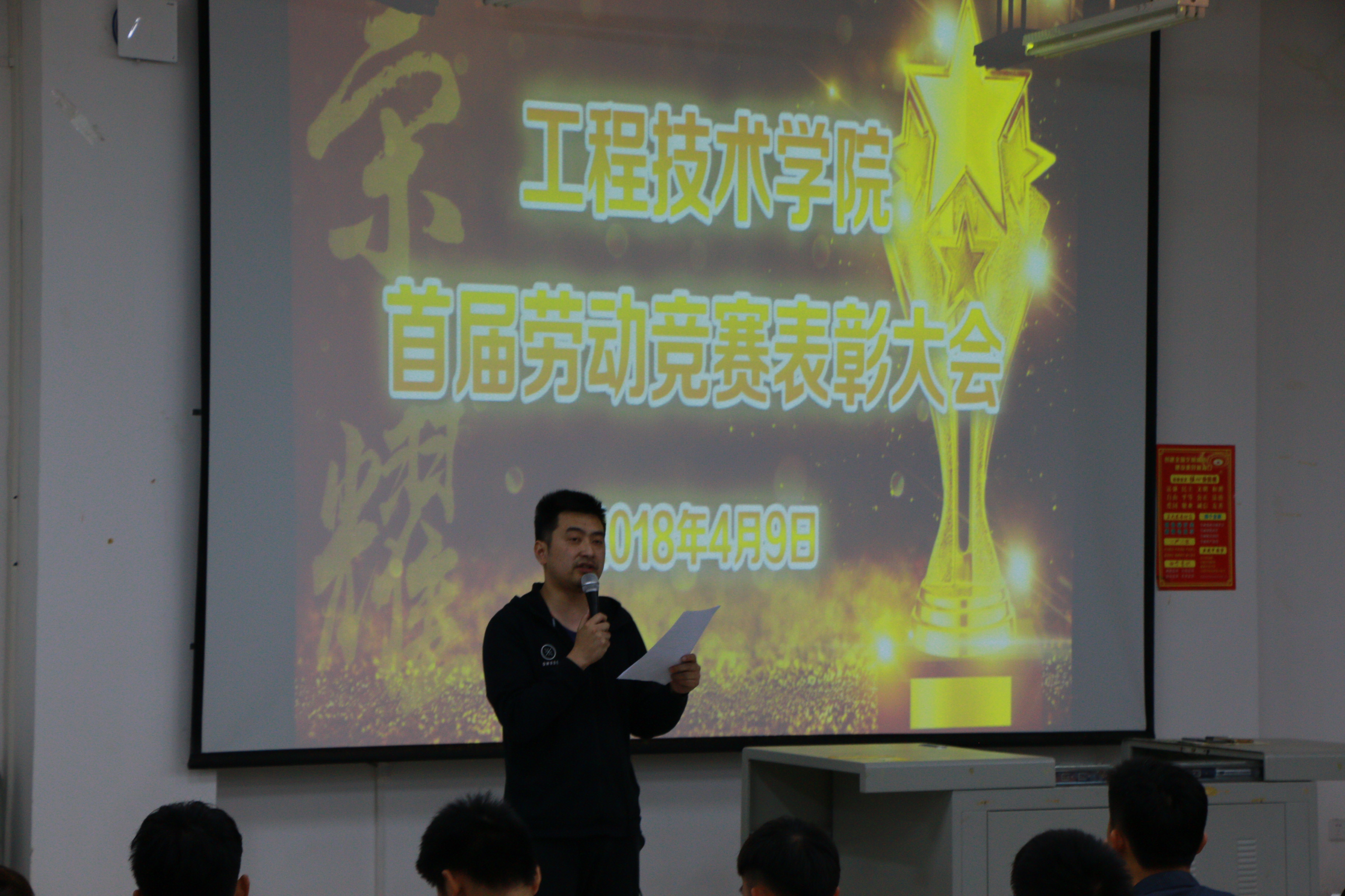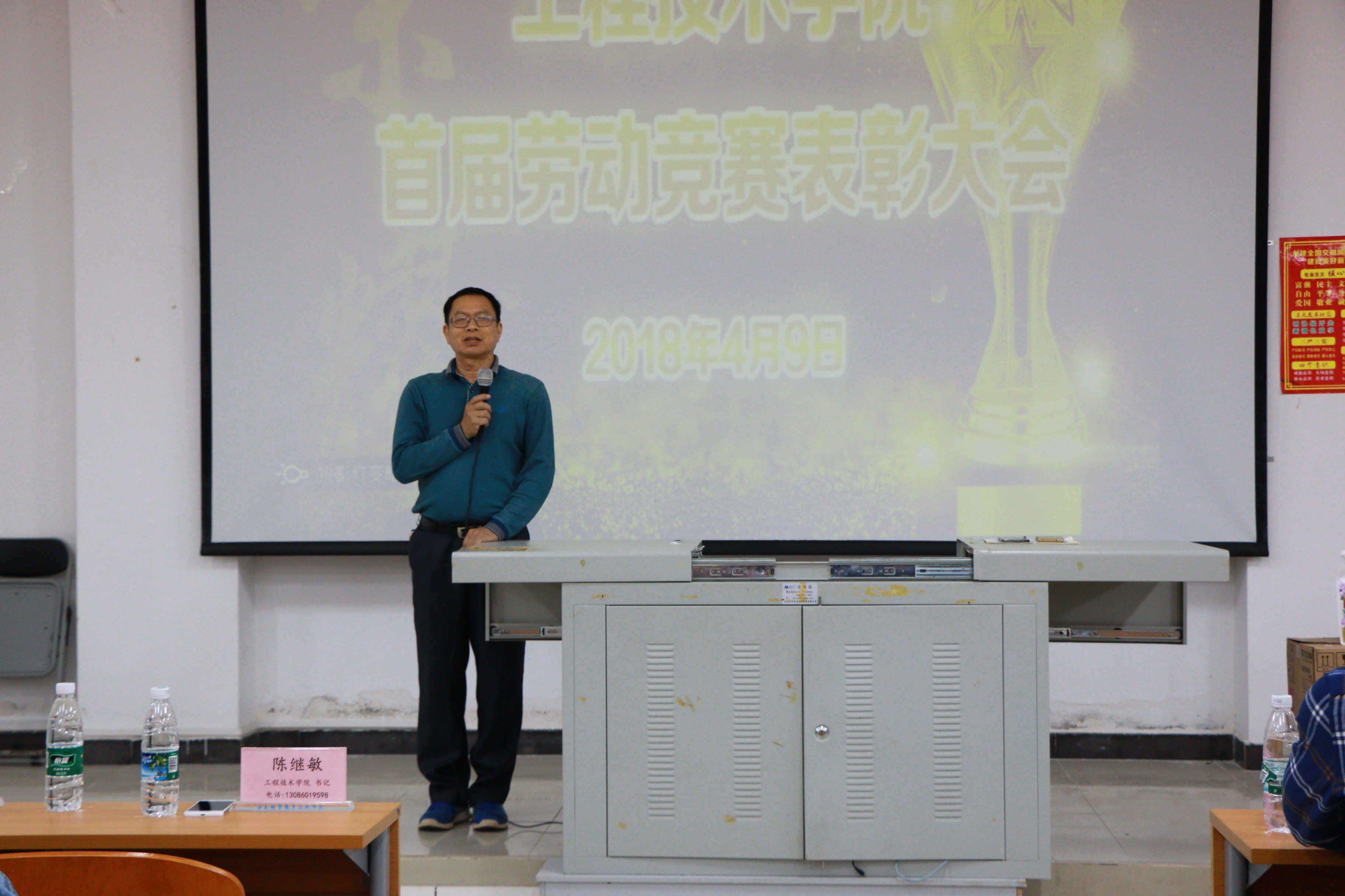 为激发同学们的劳动热情,增强班级凝聚力,2018年4月9日晚19时,工程技术公司在2教408教室召开首届劳动竞赛表彰大会,工程技术公司党总支书记陈继敏、副书记陈亚芳、学工办主任梁其钰与各辅导员出席,全体2017级新生参加,辅导员周恺主持会议。