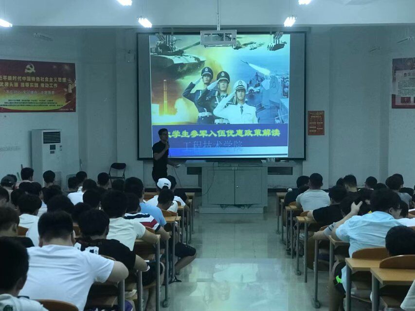会议上,团总支书记唐图老师逐一的讲解部队培养和个人发展、保留学籍的优惠政策、国家资助学费的优惠政策、退役后开学优惠政策、退役后优业安置优惠政策等老员工在校参军所顾虑的问题,并列举了几个在校参军回来就读同学的所感所获。
