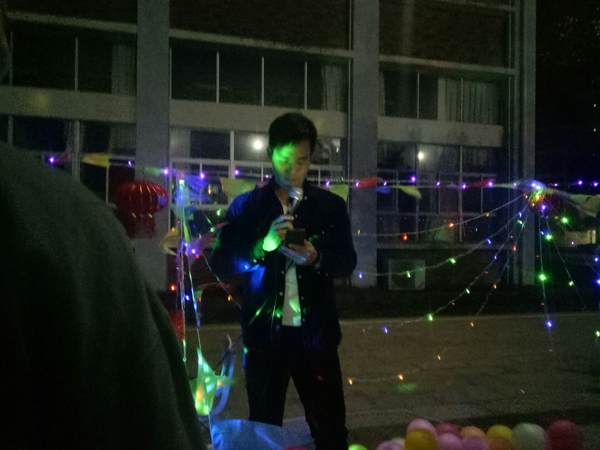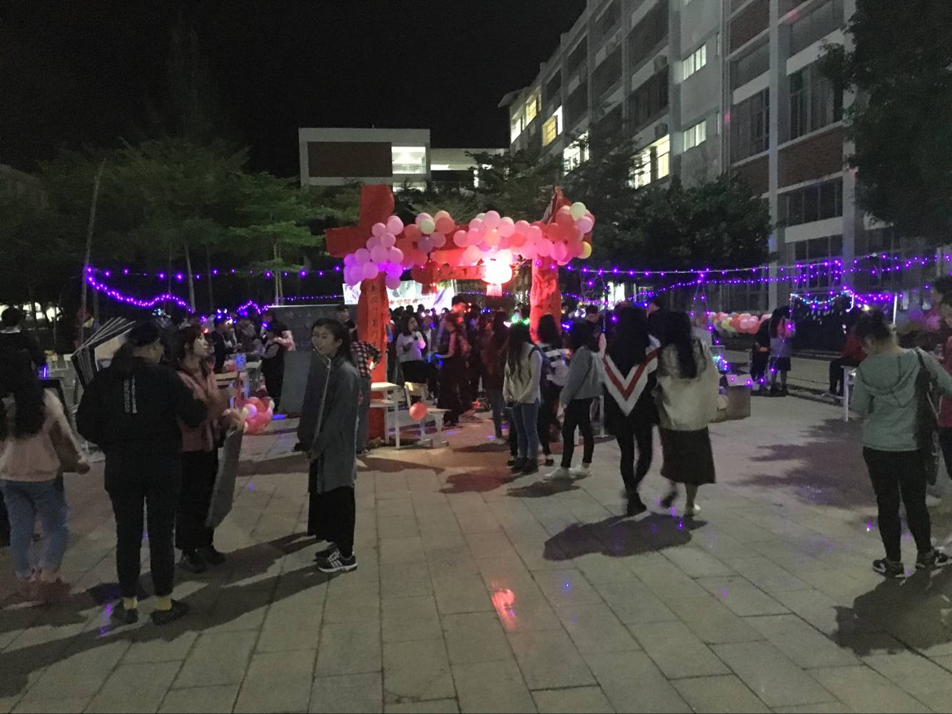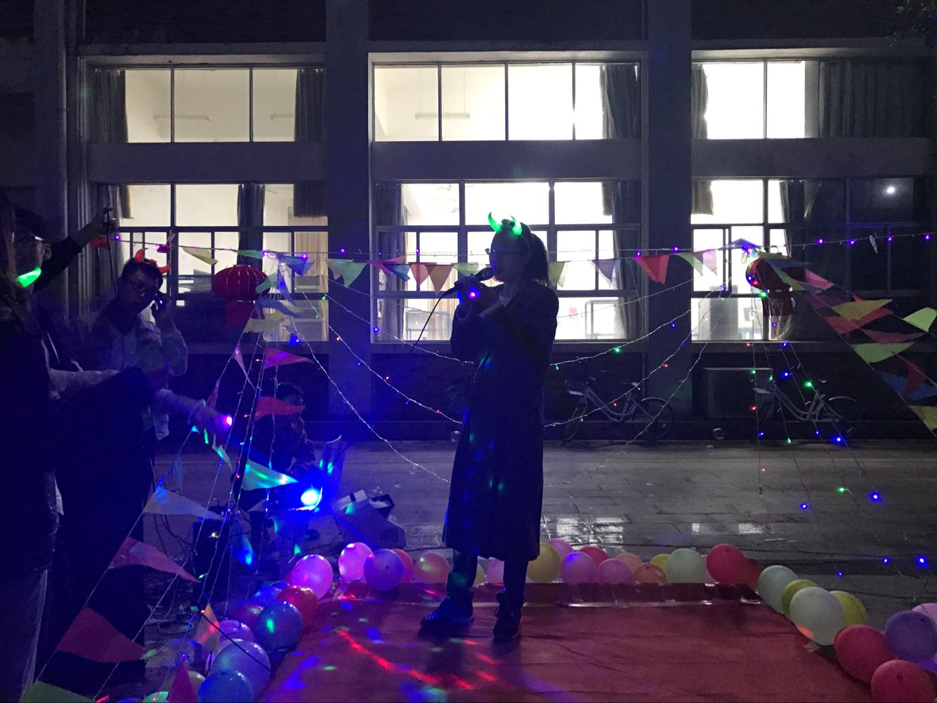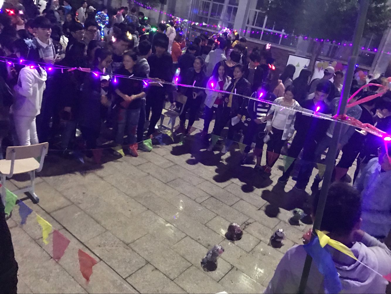 下午两点半,全体团学青成员已经聚集在活动地点,大家秩序井然地签到后,便回到自己的工作岗位上积极动手准备游园会需要的物资,并布置场地。今年的元旦游园会以趣味性、游艺性的综合模式展示,此次活动共分为6个活动项目,分别是猜字谜赢对联、套圈赢礼物、吹乒乓球、绑脚踩气球、竹竿舞和现场K歌。