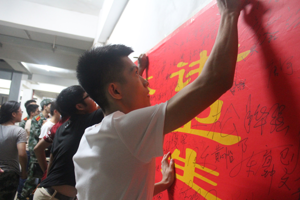 接下来,由陈继敏书记对员工到校承诺以及军训期间具体安排进行了详细说明。书记通过讲一些历史事件让同学们懂得纪律的重要性,明白没有铁的纪律,就没有钢的成就。针对公司工科员工的特点,特地制定了新生纪律制度,守纪律、懂礼貌、讲卫生、不旷课、不打架、不赌博,让每个新生在横幅上签名,承诺自己一定会做到这几点。最后,会议以全体成员庄严宣誓画上了圆满的句号。