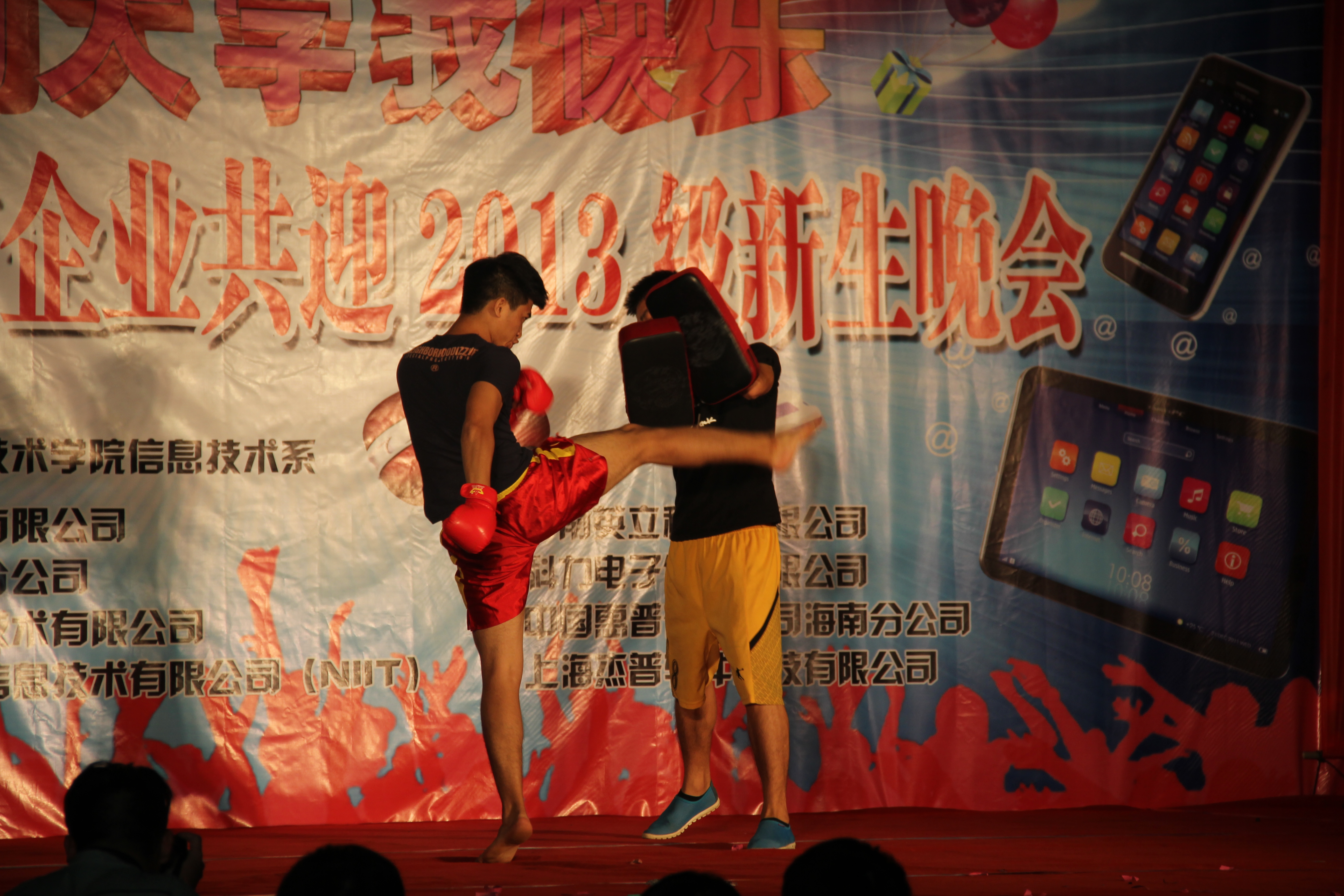 在一阵动感十足的音乐过后,晚会第一拨高潮开始了——散打表演,一个完全由12级网络2班卢玉俊自己创新的节目,一个展现自己的节目,一个秀出自己的节目.看台上,灯光迷离;观台下,群起欢呼,一位位观众变成欢乐的精灵.演员们脱下了员工装,换上了散打服,打着硬而有力的散打,用自己特有的形体语言解释生活,今天的你们才是其中的主角,今夜让欢乐与激情在活动中心成为永恒的主题……