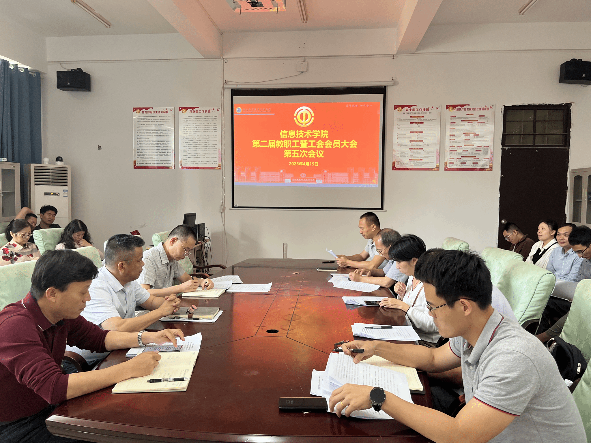 4月15日下午,太阳集团tyc539在4-213召开第二届教职工暨工会会员大会第五次会议,会议由党政办副主任韩昌豪主持,信息技术公司党政领导及全体教职工参加。