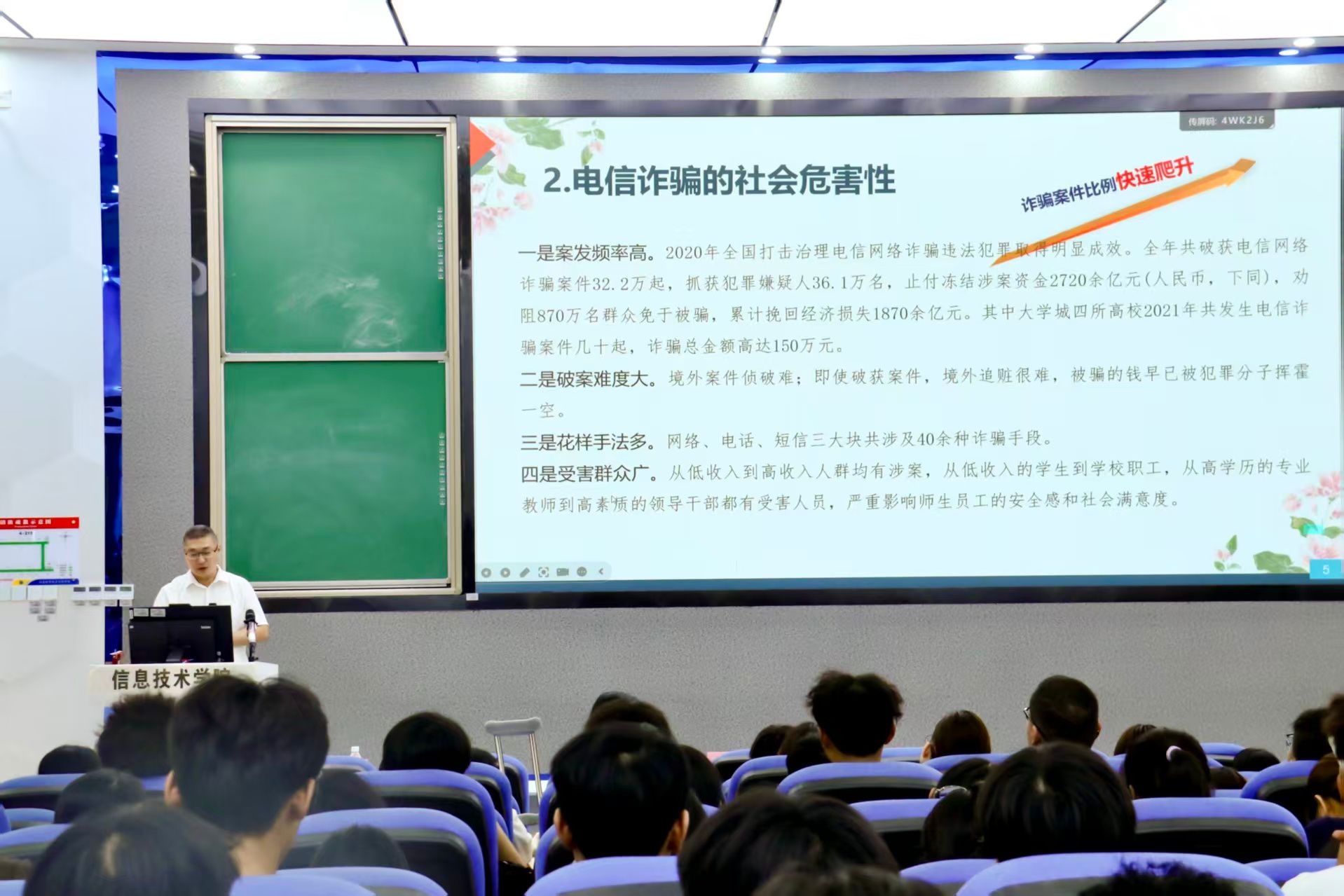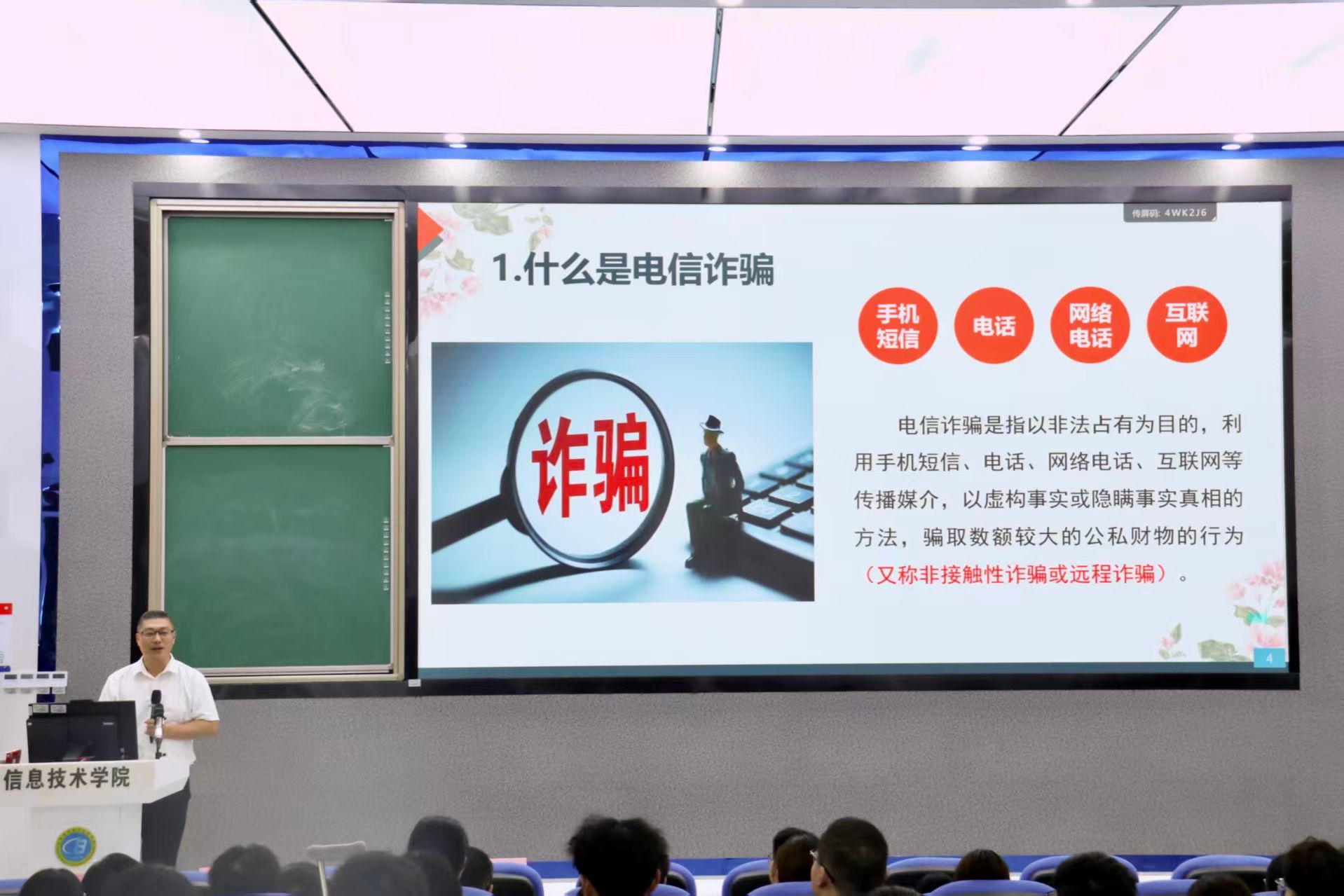 9月17日,太阳集团tyc539在4-215教室举办2025级新生入学教育专题讲座,公司党总支副书记黄守官担任主讲人,为新生们带来了一场生动实用的防范电信诈骗知识分享。