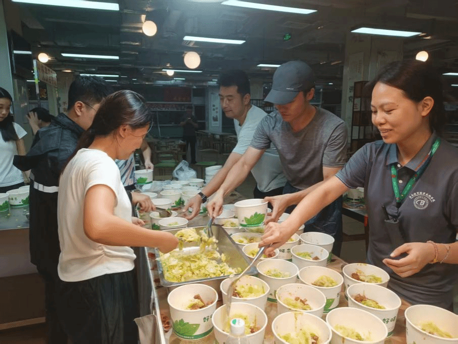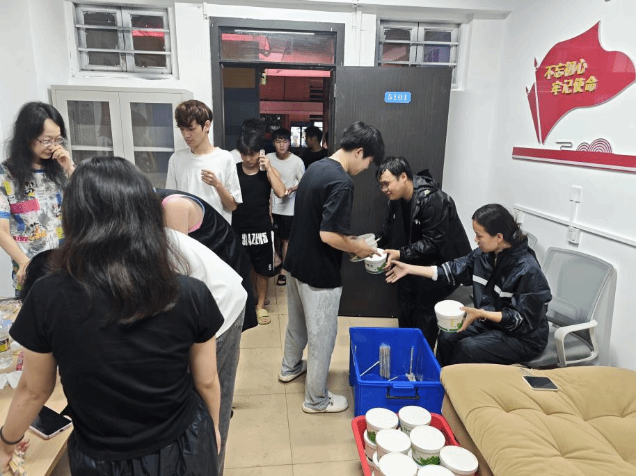 10月5日下午台风过后,为避免员工外出存在安全隐患,公司组织辅导员前往同学食堂,将餐食精准配送至负责楼栋,顺利完成餐食发放任务,保障同学基本生活需求。